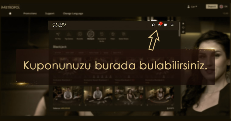 Casino Metropol canlı casinoda kampanya dahilindeki masalarda oynayarak başlayın. Kampanya için gereken bahisi oynadığınızda kupon kazanırsınız. Kupon kazandığınızı da aşağıdaki görselde görebileceğiniz gibi bir mesajla size bildiririz.